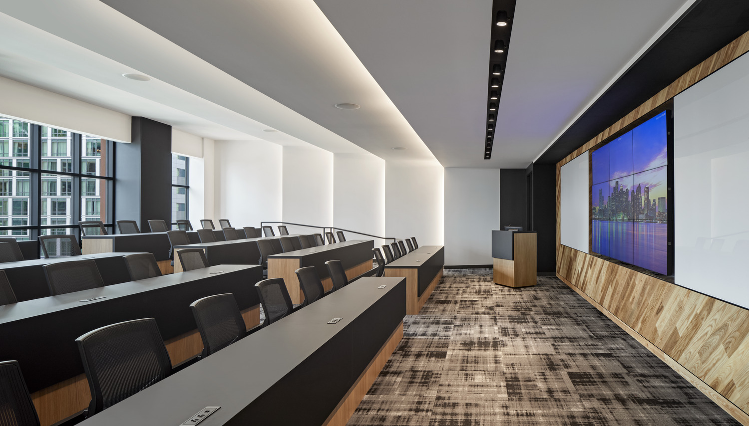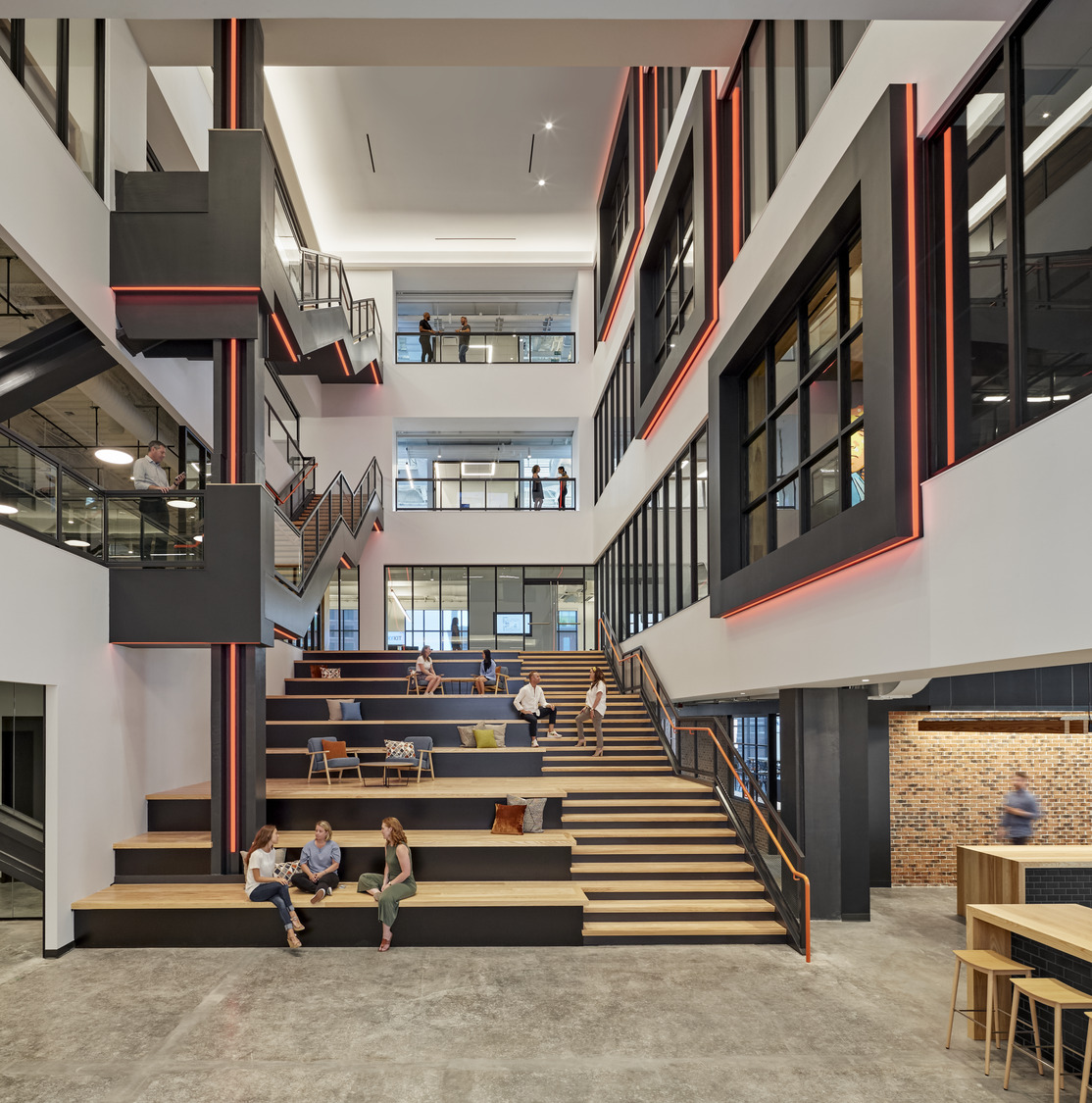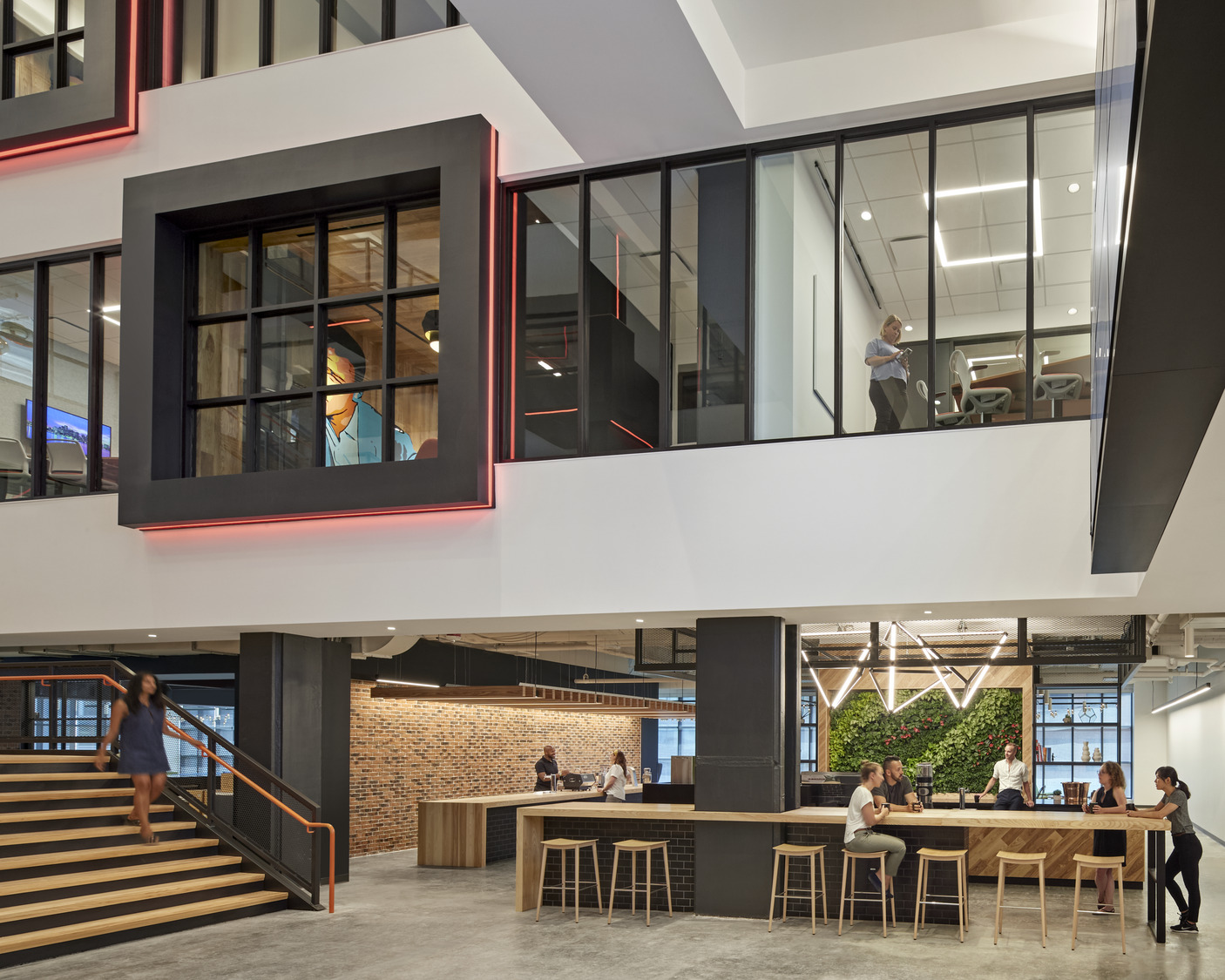 Rapid7, a leading provider of analytics and automation solutions for security and IT professionals, consolidated its downtown teams and engineers from its previous location in Cambridge to a headquarters in downtown Boston. Conceived as a vertical ecosystem, the Boston headquarters includes a number of themed, hospitality-style spaces for employees to enjoy and use as a retreat from standard office-style environments. The lighting design mimics this intended style, with warm and inviting fixtures and pendants throughout the robust amenity hubs. Lighting details also incorporate Rapid7’s signature orange color, most prominent in the four-story atrium and connecting stair.