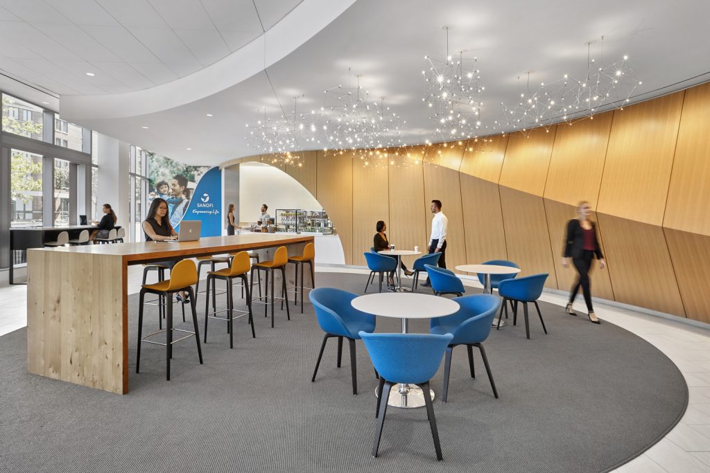 Global biotechnology company Sanofi Genzyme relocated its Cambridge headquarters from a signature building at 500 Kendall Square to a newly built, 10-story, 541,000-square-foot Class A lab and office building at 50 Binney Street. The pharmaceutical giant’s Binney Street headquarters features office and laboratory workspaces to accommodate growth for 1,300 employees, and includes a large dining area with an outdoor terrace on the 10th floor. Lighting incorporates a mix of traditional office lighting for work areas and decorative pendants for public spaces.