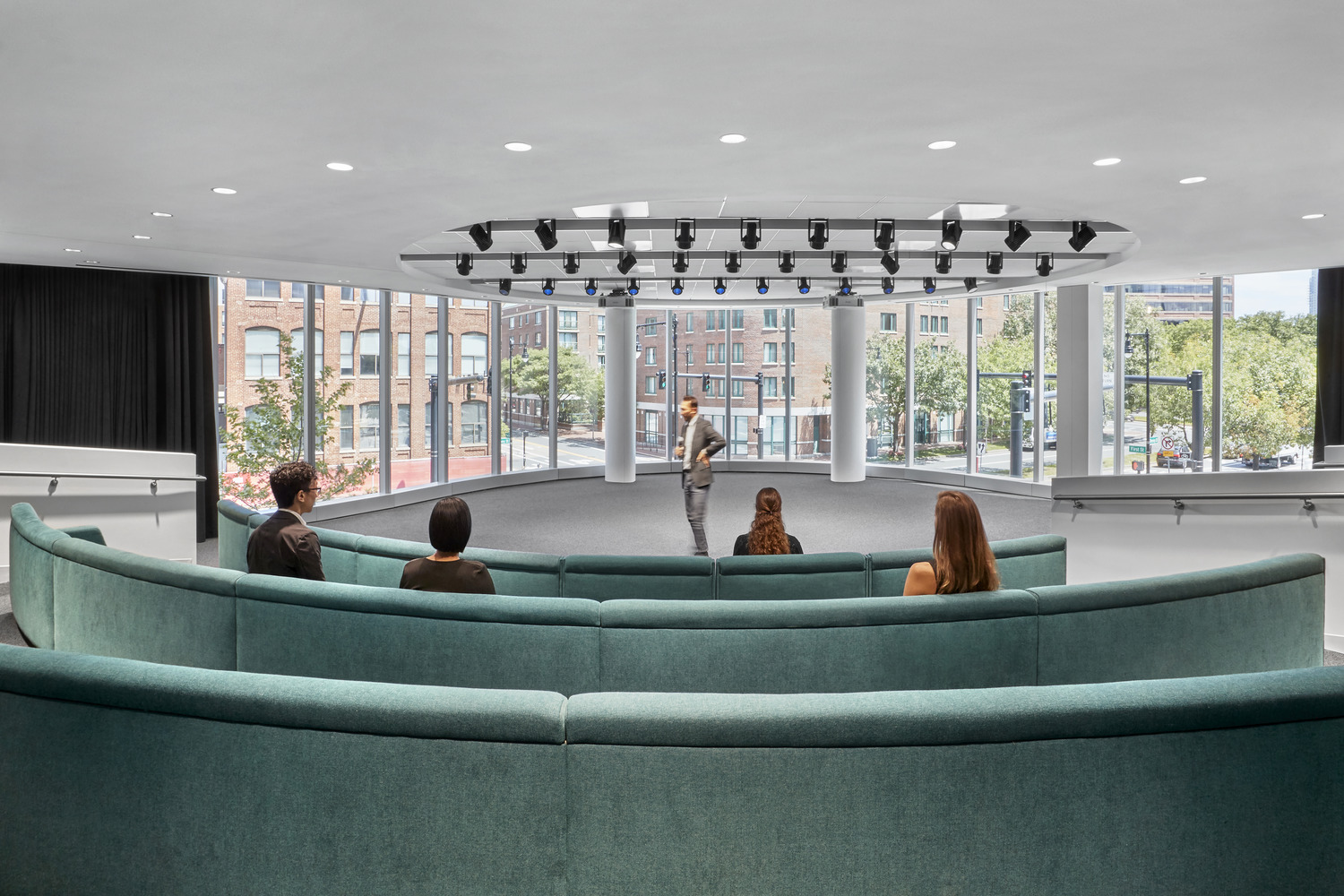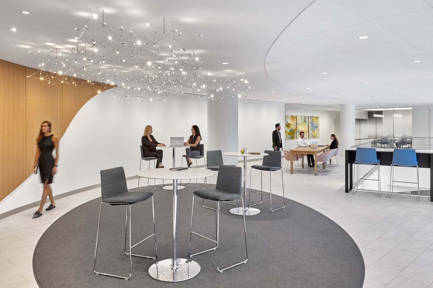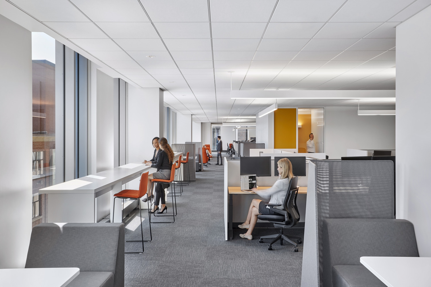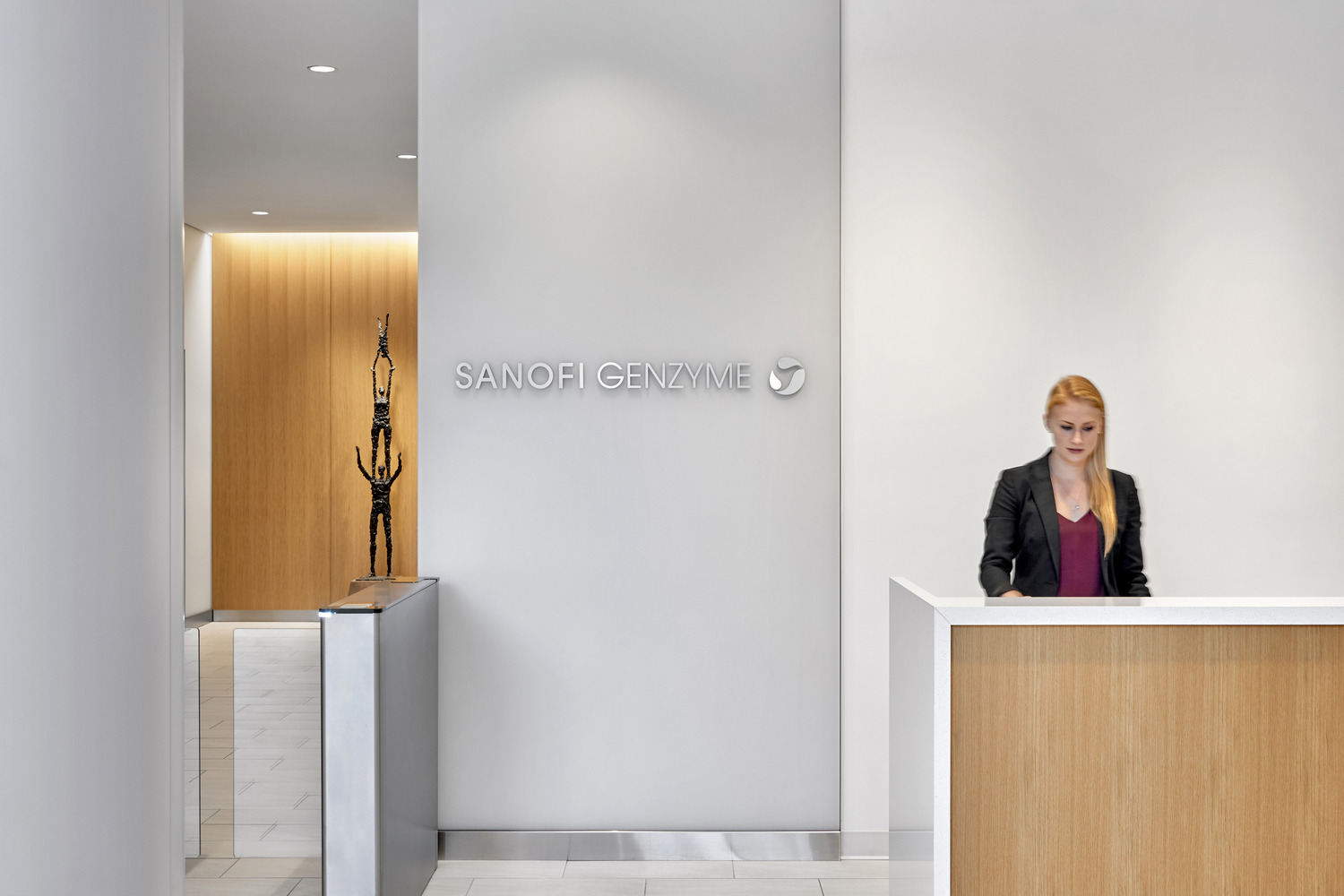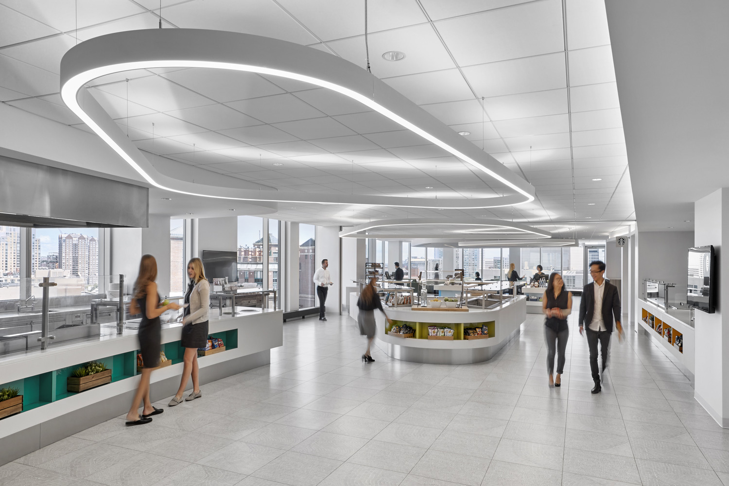 Global biotechnology company Sanofi Genzyme relocated its Cambridge headquarters from a signature building at 500 Kendall Square to a newly built, 10-story, 541,000-square-foot Class A lab and office building at 50 Binney Street. The pharmaceutical giant’s Binney Street headquarters features office and laboratory workspaces to accommodate growth for 1,300 employees, and includes a large dining area with an outdoor terrace on the 10th floor. Lighting incorporates a mix of traditional office lighting for work areas and decorative pendants for public spaces.
