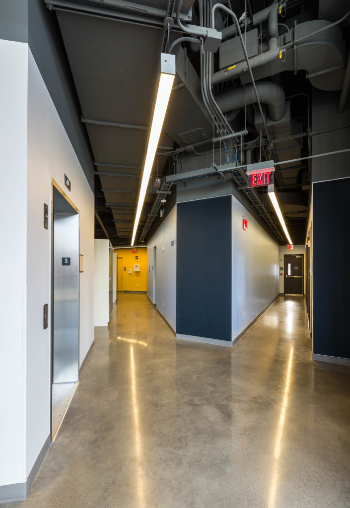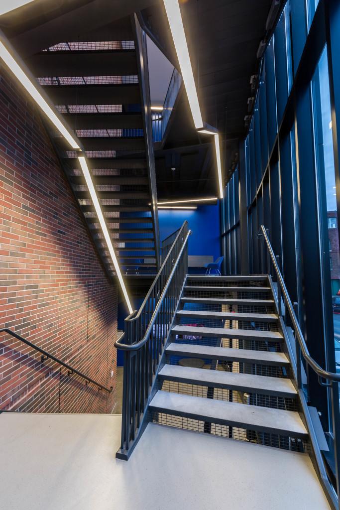 The brick wall is enclosed in a glass sheath, and the main communication stair passes in the space between the two. Following the stair run is a custom fluorescent fixture, which echoes its angular layout. Highly visible from the highway, the fixture complements the building’s design and provides a fresh new face for one of Boston’s venerated institutions.