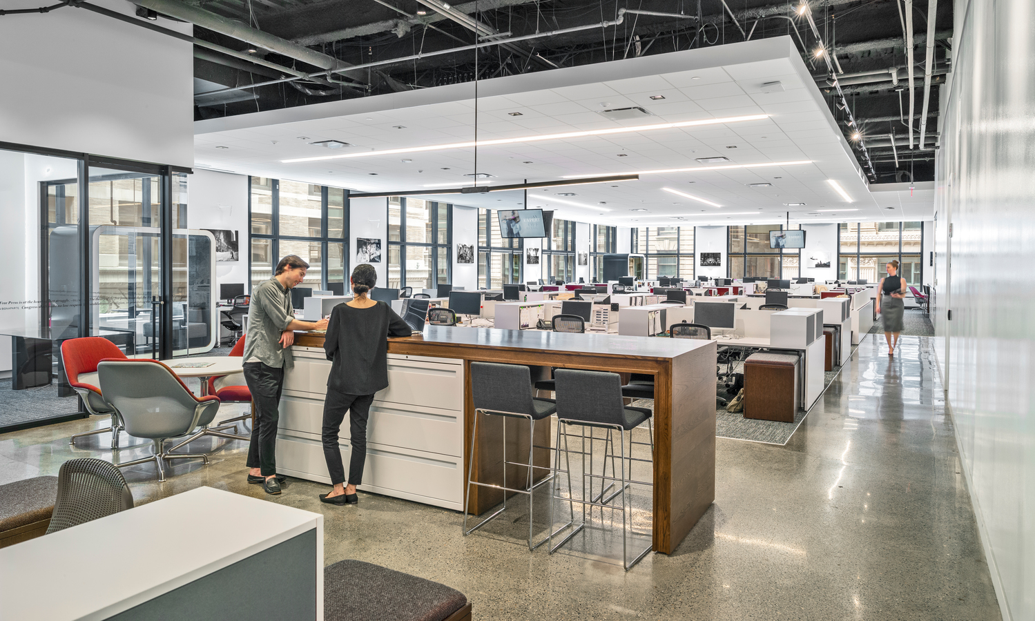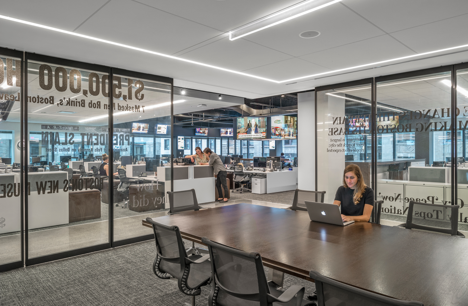 A world leader in journalism, the Boston Globe recently relocated from its Morrissey Boulevard facility to the second and third floors of 53 State Street in vibrant downtown Boston. The renovation includes offices space, conference rooms, common areas featuring social spaces, a newsroom “hub”, and reuse of a grand staircase in the building lobby as the main entrance. Offering a clean and minimalistic aesthetic, the lobby uses discrete low-brightness downlights interspersed with decorative pendants, and repurposes the ‘B’ and ‘G’ from the Globe’s former headquarters sign. Office spaces are comfortably bright, taking advantage of linear fixtures integrated within the ACT support system. Conference rooms extend this clean aesthetic, employing a rectilinear ring of light around each room with a blade of clear acrylic.