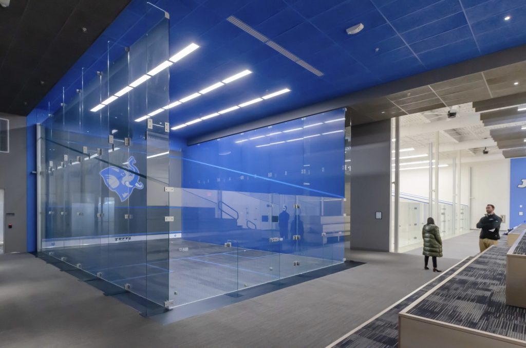 This donor-funded project created a single-story addition to the Tisch Athletics Complex. The new space provides 8 squash courts, a spectator area, team room and lounge. A centrally-located championship court with glass on three sides provides a venue for showcase matches.
