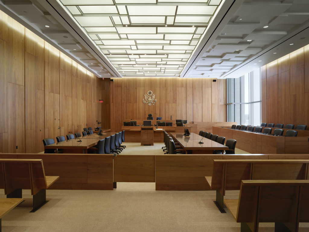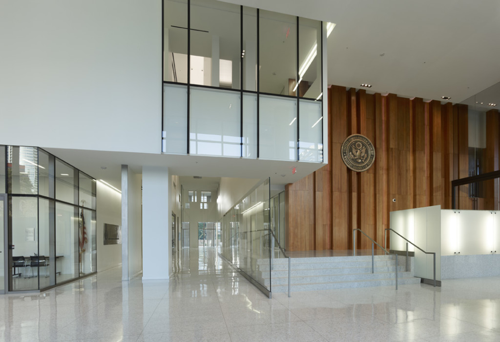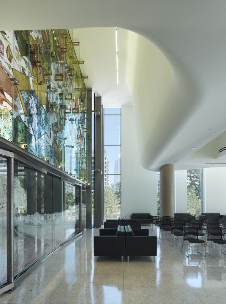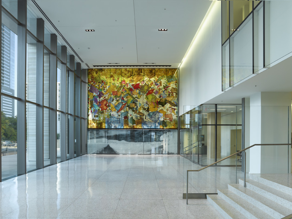 public as for the inner workings of the judicial system. A two-story glass art wall was commissioned to separate the grand lobby from the jury assembly room beyond, while also acting as a luminous mural, to be experienced by visitors and passers-by alike.