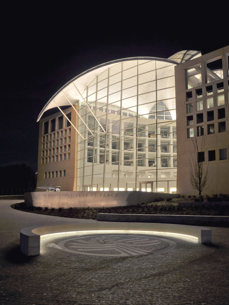 Prominently located near the Lincoln Memorial in Washington, D.C., the United States Institute of Peace contains offices, an international conference center, and public exhibition and event space. Sophisticated lighting control systems minimize energy use, and contributed to the building’s LEED Gold certification. At night, the translucent wing-like roof forms glow, illuminated magically by invisible sources.
