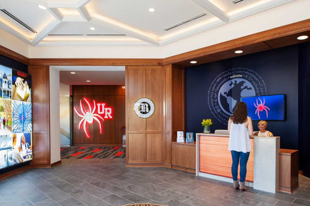 The neo-Gothic Queally Center at the University of Richmond is the new home for Admissions, Financial Aid, Career Services, the Bursar’s and the Registrar’s Offices. The classical façade and courtyard conceal some up-to-date interiors and programming for a modern university, including a 500-seat partitionable lecture hall, themed tower rooms, and a unique reception space.