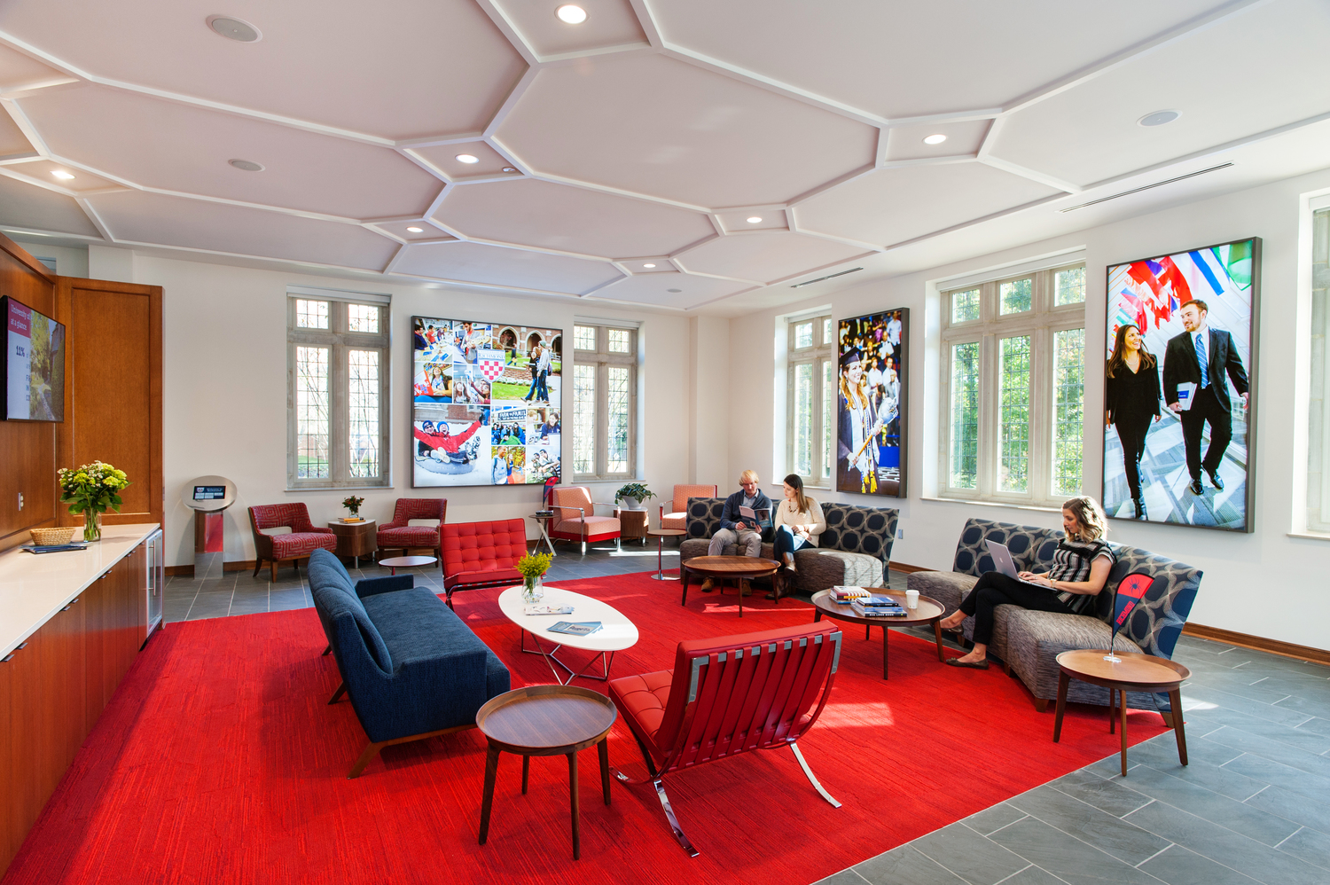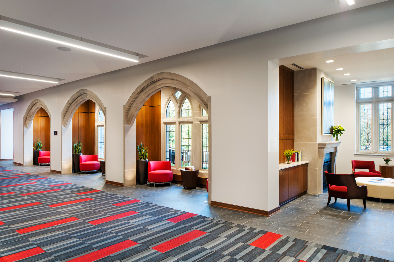 The neo-Gothic Queally Center at the University of Richmond is the new home for Admissions, Financial Aid, Career Services, the Bursar’s and the Registrar’s Offices. The classical façade and courtyard conceal some up-to-date interiors and programming for a modern university, including a 500-seat partitionable lecture hall, themed tower rooms, and a unique reception space.